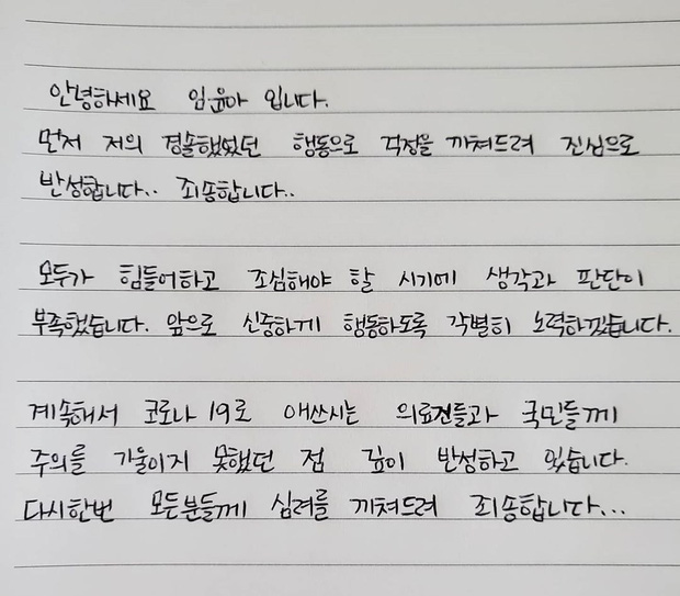 YoonA sau đó cũng đăng lá thư viết tay: "Xin chào, tôi là YoonA. Đầu tiên, tôi xin chân thành nhận lỗi về hành động thiếu suy nghĩ và gây lo ngại của mình. Tôi đã bất cẩn và không xem xét kỹ tình hình, khi mà nhiều người vẫn đang vật lộn để chống lại dịch bệnh. Trong tương lai, tôi sẽ đặc biệt cẩn thận hơn với hành động của mình. Tôi đang sâu sắc tự kiểm điểm vì đã không nghĩ đến sự khó khăn mà các y bác sĩ phải đối mặt cũng như sự thận trọng của người dân trong bối cảnh đại dịch đang còn nhiều nguy cơ. Một lần nữa, tôi xin lỗi vì đã gây lo lắng cho nhiều người".