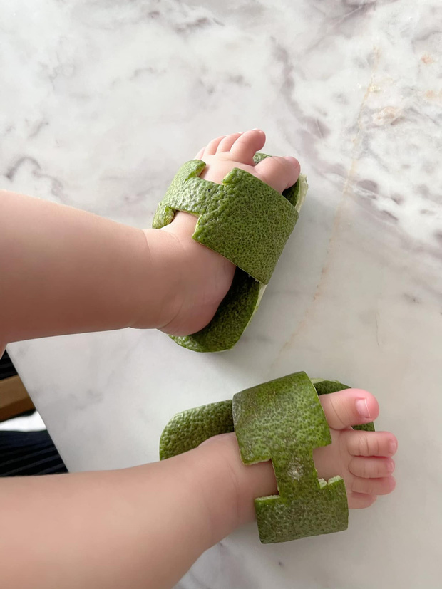 Mới đây, trên trang cá nhân, Đàm Thu Trang vừa khoe đôi dép hiệu Hermes bằng vỏ bưởi do chính tay cô làm để dành tặng con gái cưng Suchin, kèm theo đó là dòng chú thích: "Mẹ mới sắm đôi 'Hơi mệt' để muỗi không chích em".