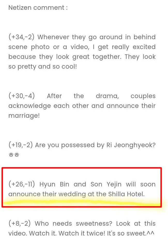 Ngay khi thông tin này được hé lộ trên chương trình của đài POP FM 91.7, cộng đồng mạng đã thi nhau bàn tán trên khắp các diễn đàn. Đáng chú ý, trong số những bình luận thể hiện sự phấn khích, có một dân mạng đã đề cập đến đám cưới của cặp đôi "Hạ cánh nơi anh". Cụ thể, người này nói rằng: "Hyun Bin và Son Ye Jin sẽ sớm thông báo về đám cưới của họ tại khách sạn Shilla". Được biết, Shilla là khách sạn sang chảnh bậc nhất Seoul, cũng chính là nơi Song Joong Ki và Song Hye Kyo tổ chức "hôn lễ thế kỷ" trước đó.