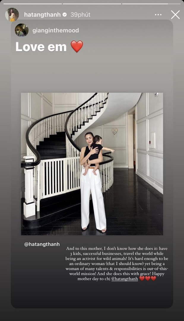 (Tạm dịch: Với người mẹ này, tôi không biết làm thế nào để cô ấy thực hiện hết được những điều này: Có 3 đứa con, kinh doanh thành công, đi du lịch khắp thế giới với vai trò một nhà hoạt động vì động vật hoang dã. Làm một người phụ nữ bình thường đã khó, trở thành một người phụ nữ có nhiều tài năng và trách nhiệm như thế này còn là sứ mệnh vượt ra khỏi thế giới này. Và cô ấy đã làm được những điều này một cách đầy vẻ vang. Xin chúc mừng ngày của mẹ, Tăng Thanh Hà).