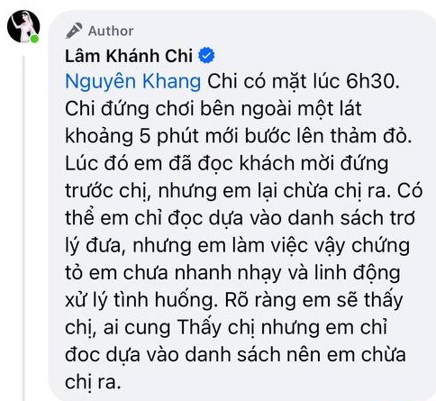 Sau đó, MC Nguyên Khang đã lên tiếng giải thích tình huống với Lâm Khánh Chi. Dưới bài đăng của nữ nghệ sĩ, MC Nguyên Khang chia sẻ: "Rất mong công chúa (biệt danh của Lâm Khánh Chi - PV) thông cảm giúp em. 18h30 em mới được dẫn phần đầu để đọc tên khách mời. Lúc đó, công chúa đã đi đến line cuối để chụp ảnh rồi. Danh sách do trợ lý đưa nên em chỉ đọc theo ghi chú của các bạn. Em đọc đến 19h30 là phải vào sự kiện chính, cũng không kịp giới thiệu hàng line khách mời đang xếp hàng lúc sau".