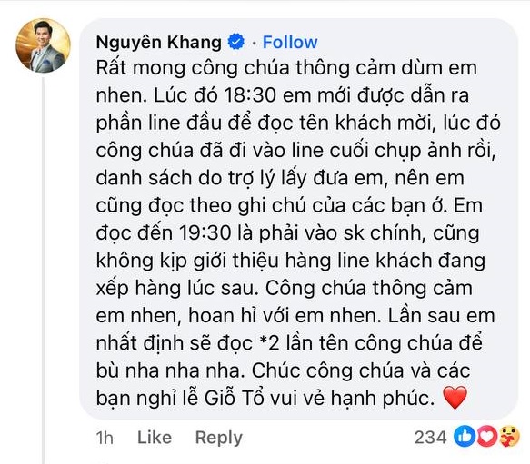 MC Nguyên Khang mong Lâm Khánh Chi thông cảm, bỏ qua sự cố tại thảm đỏ sự kiện phim. Anh cũng hứa rằng nếu có cơ hội dự sự kiện chung với Lâm Khánh Chi trong dịp khác sẽ đọc tên nữ ca sĩ 2 lần để bù đắp. "Công chúa thông cảm cho em, hoan hỉ với em nha. Lần sau em nhất định sẽ đọc 2 lần tên công chúa để bù lại. Chúc công chúa và các bạn nghỉ lễ Giỗ Tổ vui vẻ hạnh phúc", MC Nguyên Khang viết.