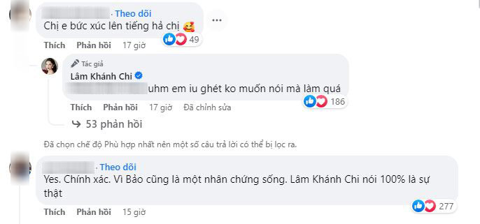 Dưới phần bình luận, khi một người bạn hỏi thăm rằng: "Chị em bức xúc lên tiếng hả chị?", Lâm Khánh Chi cũng nói thêm: "Ừ em yêu, ghét không muốn nói mà làm quá".