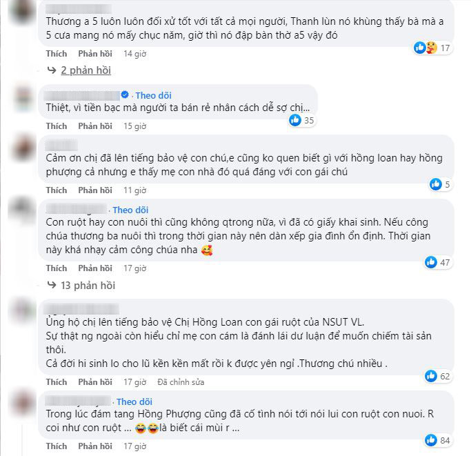 Về chuyện bị phủ nhận là con ruột của ba mình, Hồng Loan tuyên bố: "Ngày ba em mất gắn cái mác cho em là con nuôi. Bây giờ muốn biết em là con nuôi hay con ruột, mời chú 7 (NS Tiểu Linh - PV) đi xét nghiệm ADN với em, em sẵn sàng làm chuyện đó".