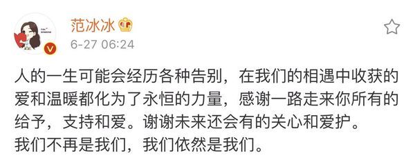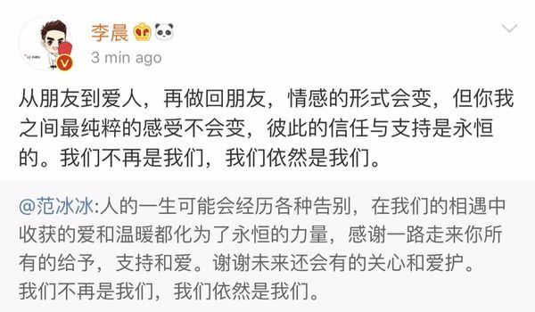 Lý Thần nhanh chóng share lại bài viết của Phạm Băng Băng: “Từ bạn bè đến người yêu, lại về làm bạn bè, hình thức tình cảm sẽ thay đổi, nhưng tình cảm thuần túy giữa chúng ta sẽ không thay đổi, luôn ủng hộ và tin tưởng là mãi mãi. Chúng ta không còn là chúng ta nữa, chúng ta vẫn là chúng ta như xưa”.