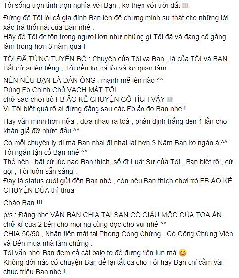 Ngày tôi dọn đồ ra khỏi nhà, tôi cầm 400 triệu cuối cùng trong sổ tiết kiệm, là tất cả tài sản lúc đó, đưa cho chính tay bà ngoại bạn rồi tôi mới đi. Bạn cũng đừng quên tôi còn 1 tờ giấy công chứng đàng hoàng, mẹ bạn vay 500 triệu từ tôi để trả nợ. Và đến giờ bạn chưa trả tôi 1 đồng bạn nhé. Tôi sống trọn tình trọn nghĩa với bạn, không thẹn với trời đất. Đừng để tôi lôi cả gia đình bạn lên để chứng minh sự thật cho những lời xảo trá thối nát của bạn nhé".