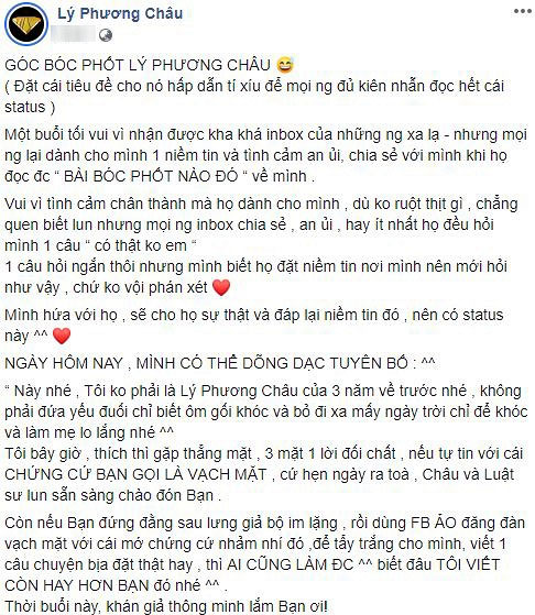 Cụ thể, trên một trang fanpage chuyên bàn chuyện showbiz xuất hiện bài viết khá dài với nội dung "vạch trần" bộ mặt thật của vợ cũ Lâm Vinh Hải. Theo đó, người này tố Lý Phương Châu không hề đáng thương như những gì thể hiện ra bên ngoài. Trong thời gian còn là vợ chồng với nam vũ công họ Lân, Lý Phương Châu đã có quan hệ ngoài luồng với bạn thân của anh. Khi ly hôn, cô còn ghê gớm đòi chiếm toàn bộ tài sản gồm nhà cửa, vũ đoàn và tiền của chồng cũ. Nếu Lâm Vinh Hải không chịu thỏa thuận, Lý Phương Châu sẽ gây khó dễ để "không ai được hạnh phúc". Không chỉ dừng lại ở đó, tài khoản này còn tố Lý Phương Châu dựng chuyện, cấm không cho con gặp Lâm Vinh Hải, không cho về bên nội nhưng lại dựng bằng chứng để tố cáo chồng cũ vô trách nhiệm.