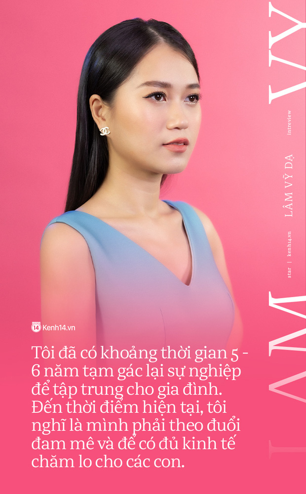 Thực sự mà nói, khi đó tôi chọn gia đình là do bất khả kháng. Lúc đó điều kiện kinh tế của mình cũng không tốt nên tôi không thể mua máy hút sữa hay thuê vú nuôi. Bánh Mì và Xá Xị cũng còn rất nhỏ, các con rất cần mẹ bên cạnh nên tôi cũng không thể bỏ con để đi làm được. Mỗi lần nhìn đồng nghiệp diễn trên sân khấu, tự nhiên nước mắt tôi rơi. Đối với Lâm Vỹ Dạ, diễn viên nó không phải là cái nghề, mà nó là cái nghiệp của bản thân, nó luôn chảy trong từng mạch máu, mỗi ngày càng mãnh liệt hơn.