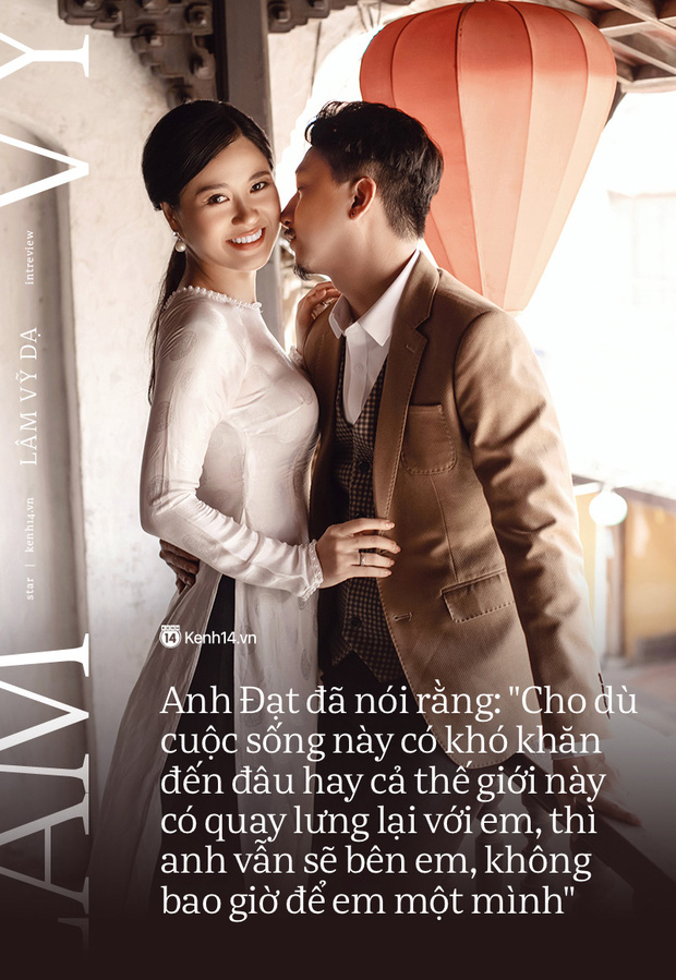 Có lần, khi tôi áp lực, anh Đạt đã nói rằng: "Cho dù cuộc sống này có khó khăn đến đâu hay cả thế giới này có quay lưng lại với em, thì anh vẫn sẽ bên em, không bao giờ để em một mình". Đây là câu nói của chồng khiến tôi rất xúc động và hạnh phúc. Tôi luôn tin rằng, dù mọi thứ có đổi thay vẫn sẽ có 1 người bên cạnh tôi.