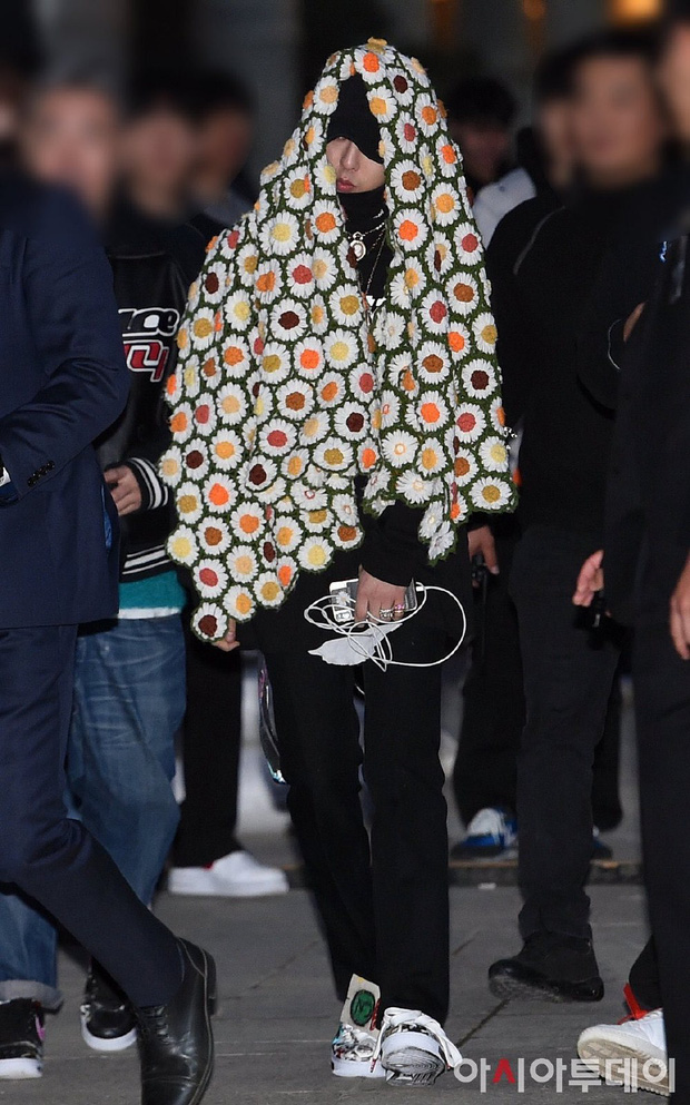 Giống như mọi lần, G-Dragon vừa xuất hiện đã lập tức gây ấn tượng bởi phong cách thời trang "không giống ai" vốn đã trở thành thương hiệu của anh. Có lẽ vì thời tiết khá lạnh nên G-Dragon phải trùm một chiếc chăn hoa lá cành kín mít trên đầu nhưng không vì thế mà độ đẹp trai của nam thần tượng bị giảm sút. Sự xuất hiện độc đáo của thủ lĩnh Big Bang nhanh chóng thu hút mọi ánh nhìn của những người xung quanh.