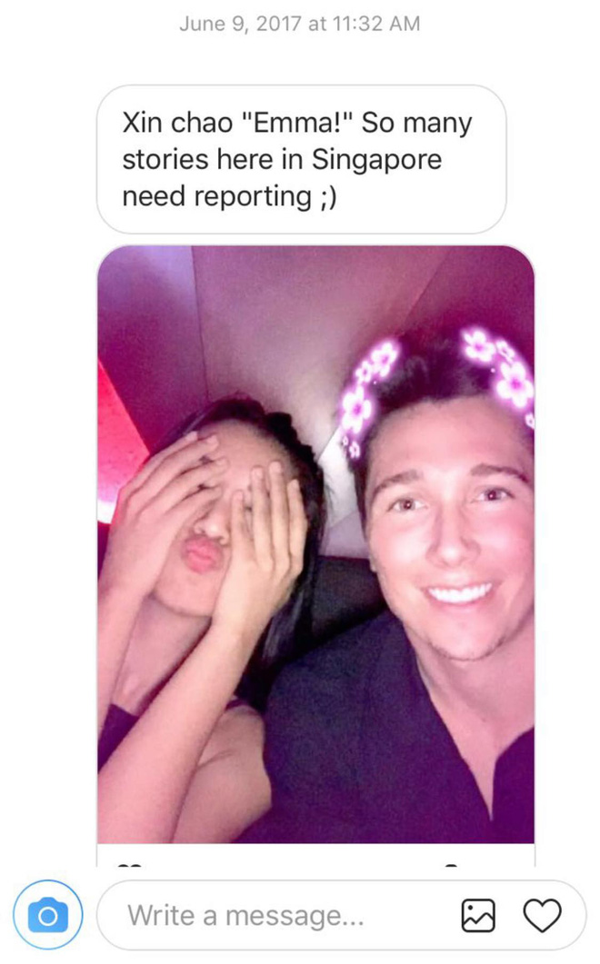 4/6 Ngày đẹp vì là sinh nhật bố mình và lần đầu gặp chồng mình. Sáng nay thức dậy ổng nhắn tin chúc mừng sinh nhật bố vợ rồi nói ra phát hiện lý thú: "Ngày này 3 năm trước anh gặp vợ của anh." Kèm cái hình này, ổng nghĩ sao chọn cái filter bông hoa gay thế này đi cua gái chứ? Và không quên lập lại câu chuyện cay cú: "Anh thân thiện vậy mà vợ không cho số điện thoại, không cho Facebook hay Instagram gì để liên lạc hết. Tới lúc kiếm được Instagram nhắn tin cả tuần lễ cũng không thèm trả lời.. Anh phải mặt dày nhắn tin nhờ Nguyễn Kim My hỏi thăm... Rồi bắt anh chờ 5 lần 7 lượt hết mấy năm trời mới chịu làm người yêu..."