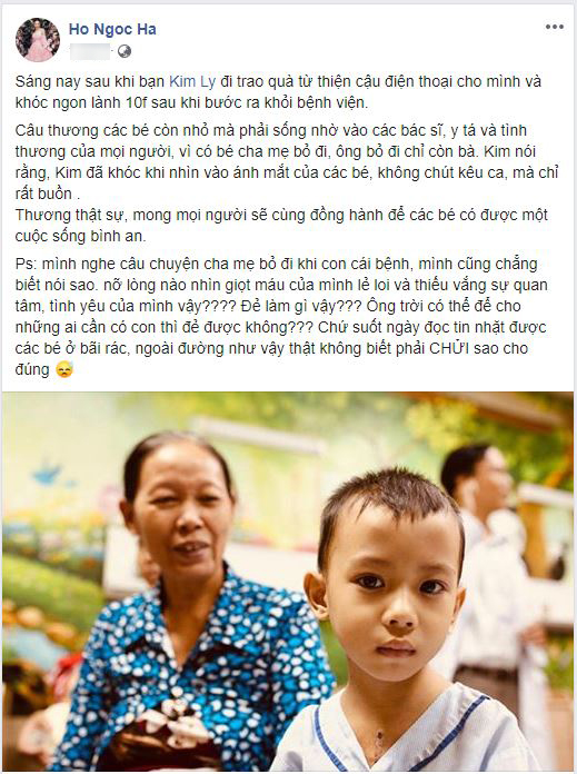Cô viết: "Sáng nay sau khi bạn Kim Lý đi trao quà từ thiện cậu điện thoại cho mình và khóc ngon lành 10 phút sau khi bước ra khỏi bệnh viện. Cậu thương các bé còn nhỏ mà phải sống nhờ vào các bác sĩ, y tá và tình thương của mọi người, vì có bé cha mẹ bỏ đi, ông bỏ đi chỉ còn bà. Kim nói rằng, Kim đã khóc khi nhìn vào ánh mắt của các bé, không chút kêu ca, mà chỉ rất buồn. Thương thật sự, mong mọi người sẽ cùng đồng hành để các bé có được một cuộc sống bình an.