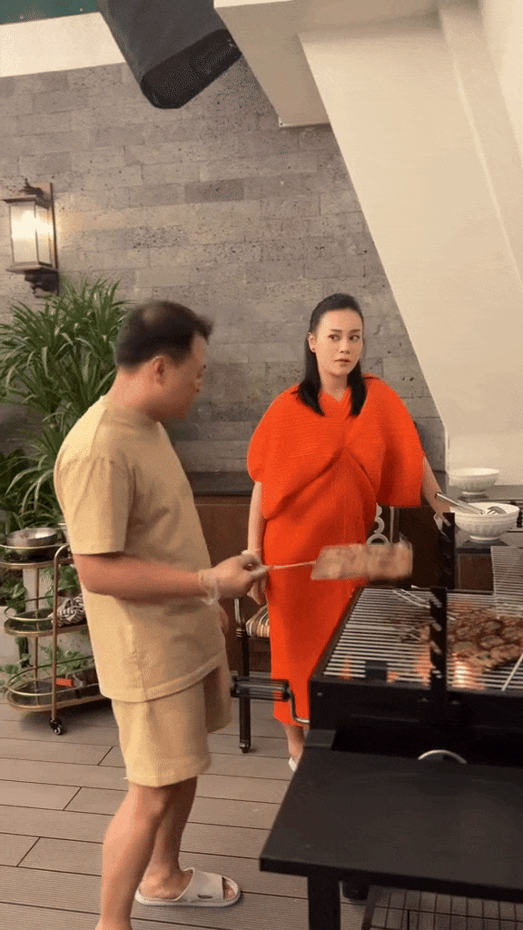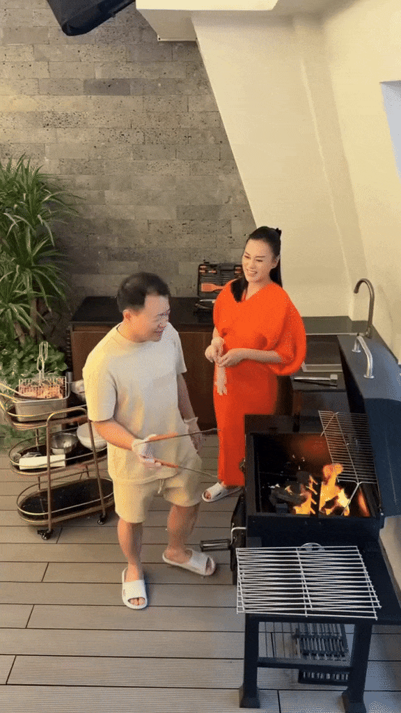Trong clip của Phương Oanh, cô sơ chế và chuẩn bị đồ ăn dưới bếp sau đó mang lên sân thượng để chồng nướng. “Lên tới nơi đã thấy người ấy bật nhạc ‘hey hey’, bếp than bùng bùng hỗ trợ rồi. Yêu thế chứ lại” - nữ diễn viên Quỳnh Búp Bê hạnh phúc khoe.