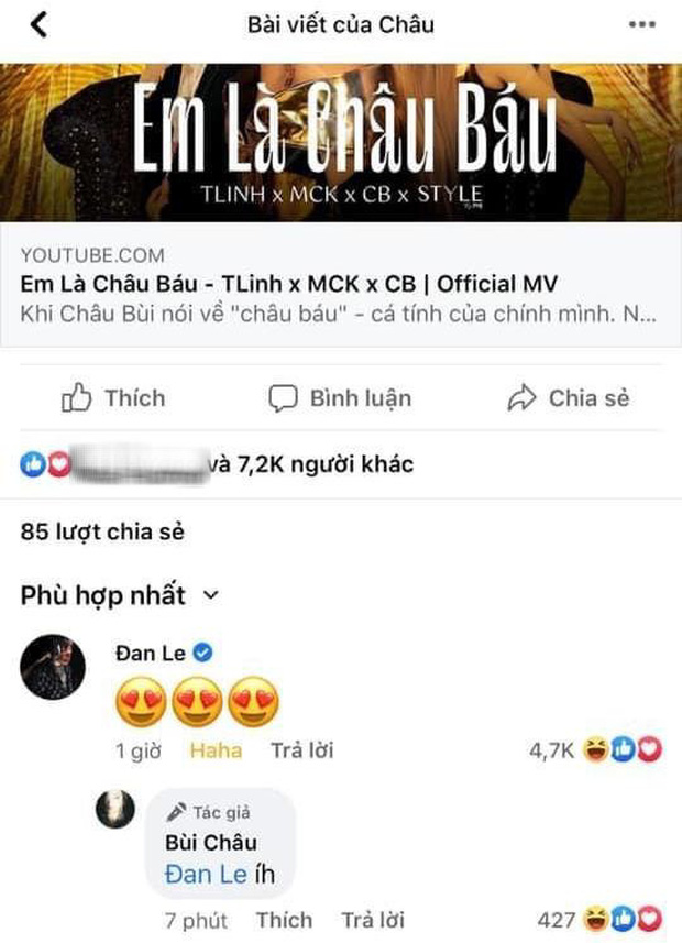 Sáng ngày 23/11, trên Facebook cá nhân, Châu Bùi chia sẻ bài viết về MV mới với sự tham gia của Tlinh, MCK. Ngay lập tức, Binz liền vào "thương thương" và để lại bình luận gồm 3 icon nhìn thôi cũng đã thấy mùi tình yêu ngập tràn. Đây là lần đầu tiên Binz chủ động bình luận trên Facebook của người ấy. Cũng lần đầu tiên, Châu Bùi trả lời như phản ứng lại màn “thả thính” của anh chàng. Động thái cực ngọt của cặp đôi khiến dân tình phải "rụng tim", bàn tán xôn xao.