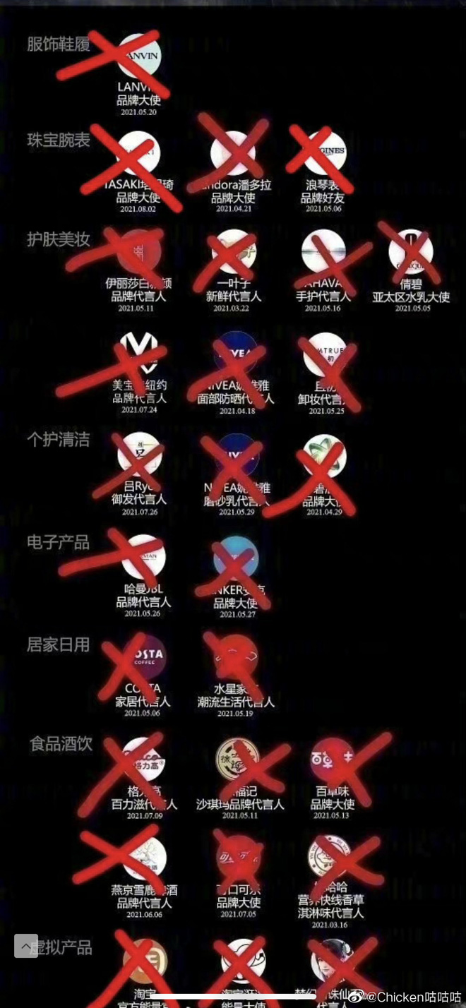 Trong số 27 thương hiệu "chạy làng" khi scandal của Trương Triết Hạn nổ ra, có rất nhiều cái tên hot như đồng hồ LONGINES, hãng thời trang LANVIN, mỹ phẩm Clinique, mỹ phẩm NIVEA, game Tân Ảo Mộng Tru Tiên, trang sức Pandora, bia Yến Kinh, bánh Glico,....