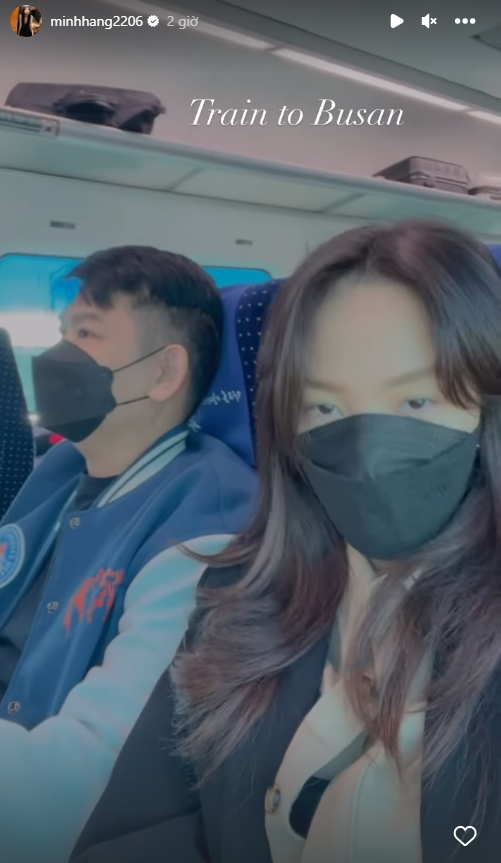 Minh Hằng đang có chuyến du lịch đến Hàn Quốc nghỉ dưỡng cùng gia đình trong giai đoạn mang thai. Nữ diễn viên liên tục cập nhật lên trang cá nhân về chuyến đi chơi của mình. Trong đó, đáng chú ý nhất là hình ảnh Minh Hằng chụp cùng ông xã khi đang trên chuyến tàu đi Busan.
