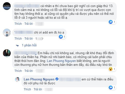 Lý giải về định kiến phân biệt giới tính này của mọi người, Lan Phương cho rằng do quan niệm từ thời phong kiến mặc định đàn ông luôn có vị trí cao hơn phụ nữ, là người kiếm tiền và có cơ hội được nhiều cô gái vây quanh.