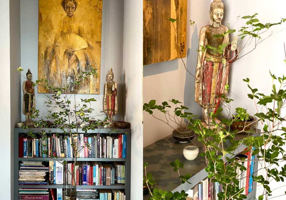 Tại TP.HCM, Hồng Nhung còn sở hữu nhà riêng triệu đô, rộng 200m2 do cô mua vào năm 2021. Trong nhà, cô trang trí nhiều tranh và tượng. Những giá sách hay mỗi góc nhà đều được điểm trang bằng bình hoa, cây cảnh mang đến sức sống mới cho không gian. Hầu hết các chi tiết trong nhà đều được chính tay Hồng Nhung lựa chọn, sắp đặt.