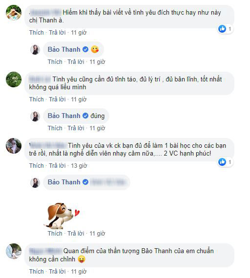 Bên dưới bài đăng, ngoài những bình luận bày tỏ sự đồng tình, ủng hộ với quan điểm của Bảo Thanh trong chuyện tình cảm, người hâm mộ cũng dành nhiều lời khen có cánh cho cuộc hôn nhân đáng ngưỡng mộ của nữ diễn viên.