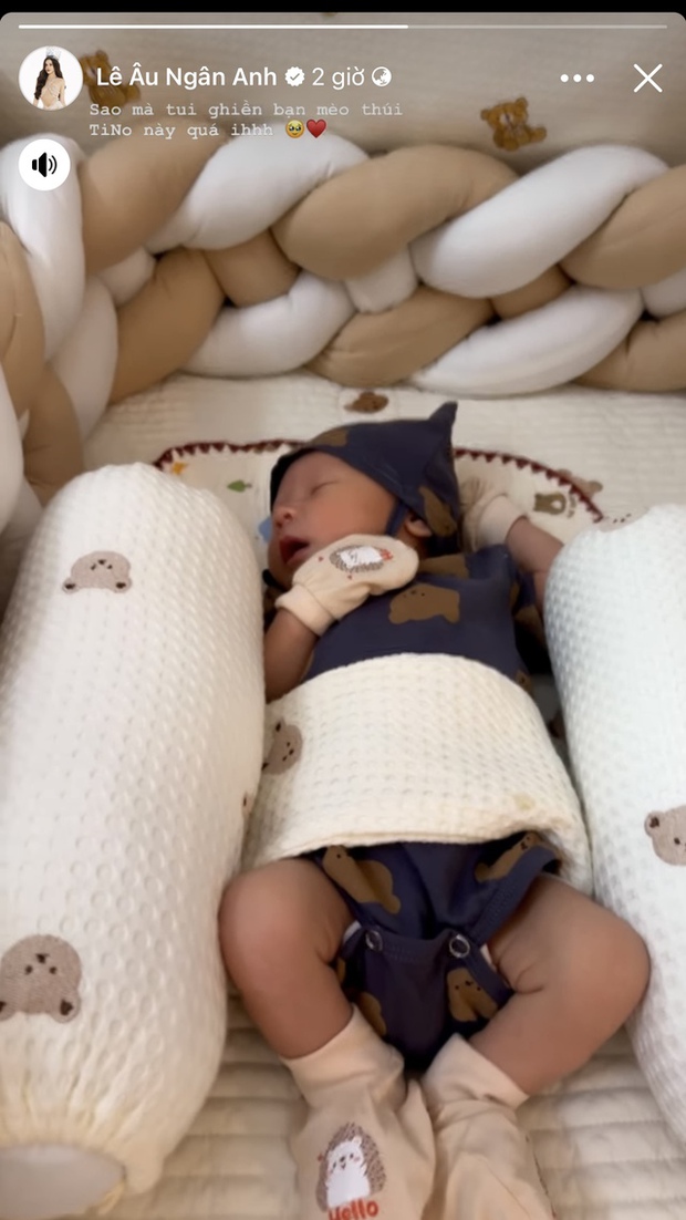 Lê Âu Ngân Anh bày tỏ sự hạnh phúc khi ngắm nhìn nhóc tỳ say giấc: "Sao mà tôi ghiền bạn mèo thối TiNo này quá đi". Bên cạnh đó, nàng hậu cũng tiết lộ đã bắt nhịp với cuộc sống mới khi có sự xuất hiện của nhóc tỳ. "Hôm nay TiNo được 12 ngày tuổi rồi, mình cũng dần quen với nhịp sống mới cùng sữa và tã bỉm, có loay hoay tất bật nhưng mà phải công nhận sự hiện diện của bé con làm không khí trong nhà lúc nào cũng tràn ngập tiếng cười", Lê Âu Ngân Anh chia sẻ.