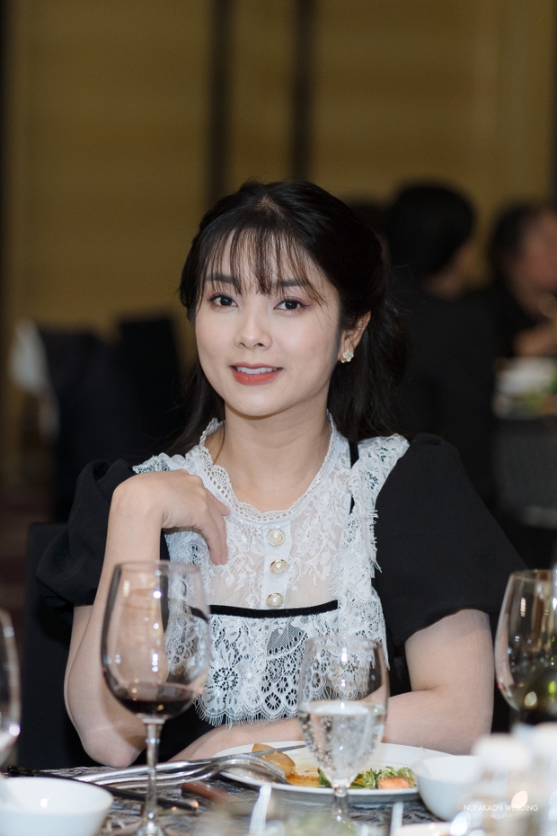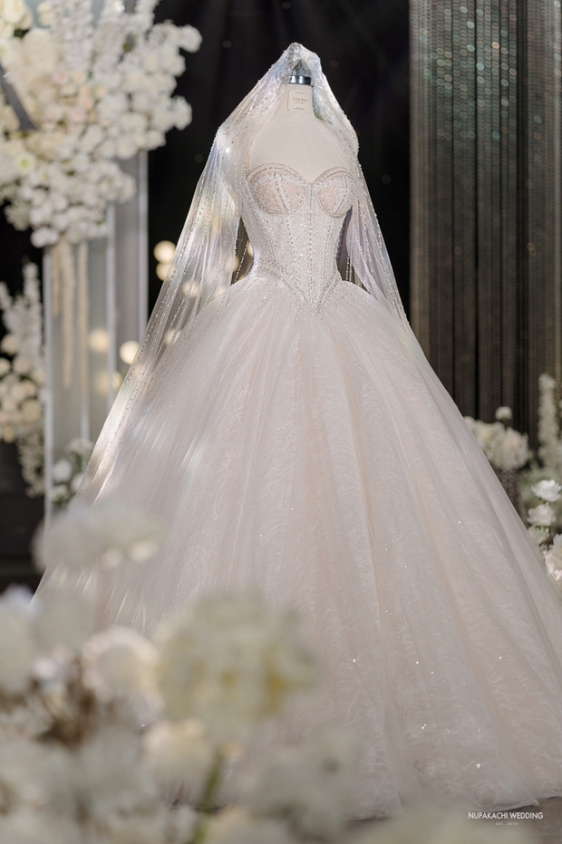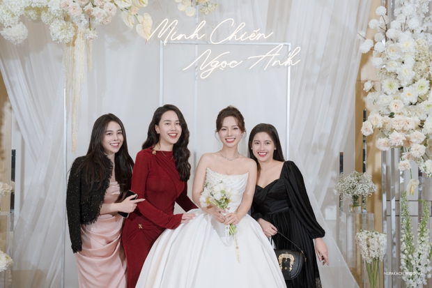 Cô dâu Ngọc Anh khoe nhan sắc mỹ miều, cô diện chiếc váy hơn 200 triệu lấy cảm hứng từ vẻ đẹp huyền ảo, lấp lánh của dải ngân hà, được thực hiện trong suốt 3 tháng. Khuôn mặt của nữ diễn viên ngập tràn hạnh phúc, vui vẻ khi chính thức được "chốt đơn" trong ngày đặc biệt. Dàn sao Việt như Đình Tú, Ngọc Huyền, Ngô Mai Phương... đã có mặt để chúc mừng "tân lan tân nương".