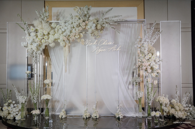 Tối ngày 8/3, trong lúc dàn mỹ nhân Việt rần rần khoe quà từ "nửa kia" thì diễn viên Ngọc Anh - nữ chính Phố trong làng gây sốt khi váy cô dâu để bước vào lễ đường cùng chồng doanh nhân. Đám cưới của diễn viên Ngọc Anh và Minh Chiến diễn ra tại một khách sạn sang trọng ở Hà Nội, quy tụ những sao Việt thân thiết đến tham dự. Không gian đón khách, lễ đường trong ngày trọng đại của diễn viên Ngọc Anh được trang trí màu trắng chủ đạo, phủ đầy hoa tươi.