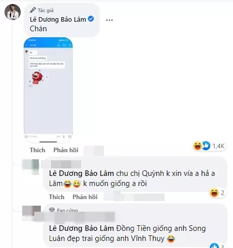 Mới đây, Lê Dương Bảo Lâm bức xúc đối đáp kẻ công kích gia đình mình. Nguyên nhân xuất phát từ việc nam diễn viên chia sẻ đoạn hội thoại bông đùa với bà xã Quỳnh Quỳnh.