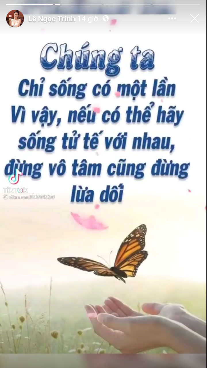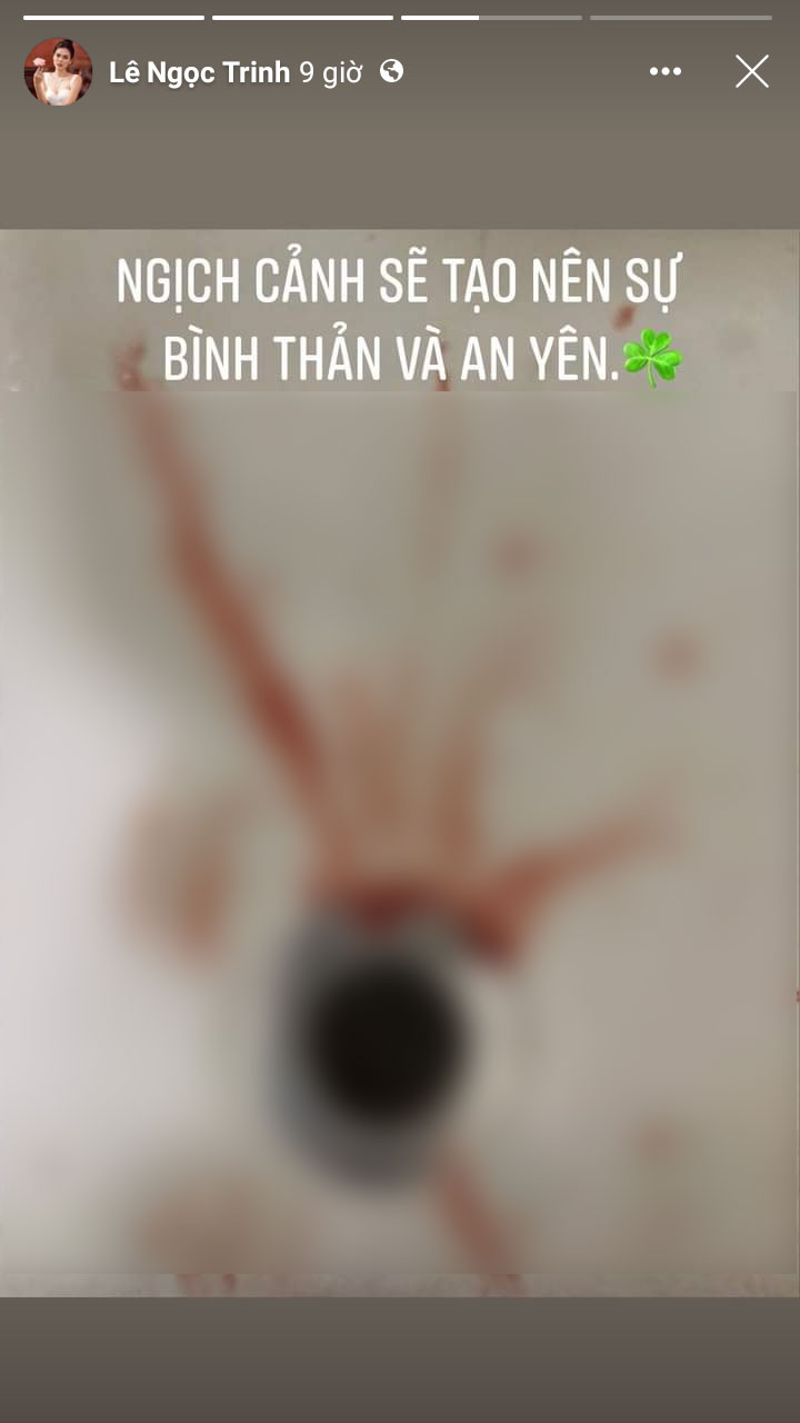 Cho đến khuya 2/8, Lê Ngọc Trinh bất ngờ đăng một loạt story thể hiện tâm trạng buồn bã, đáng chú ý nhất là hình ảnh chụp chiếc bồn nước đầy máu đính kèm dòng chú thích: "Nghịch cảnh sẽ tạo nên sự bình thản và an yên". Khoảnh khắc này đã khiến nhiều người vô cùng lo lắng và liên tục gửi lời động viên người đẹp họ Lê.