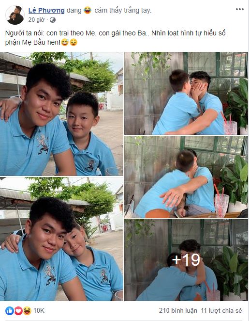 Mới đây, Lê Phương đã chia sẻ loạt khoảnh khắc cực tình cảm giữa con trai và ông xã trẻ tuổi khiến bất cứ ai nhìn vào đều ngưỡng mộ xen lẫn ghen tị. Nữ diễn viên vui vẻ khoe: "Người ta nói: con trai theo Mẹ, con gái theo Ba. Nhìn loạt hình tự hiểu số phận Mẹ Bầu hen!".