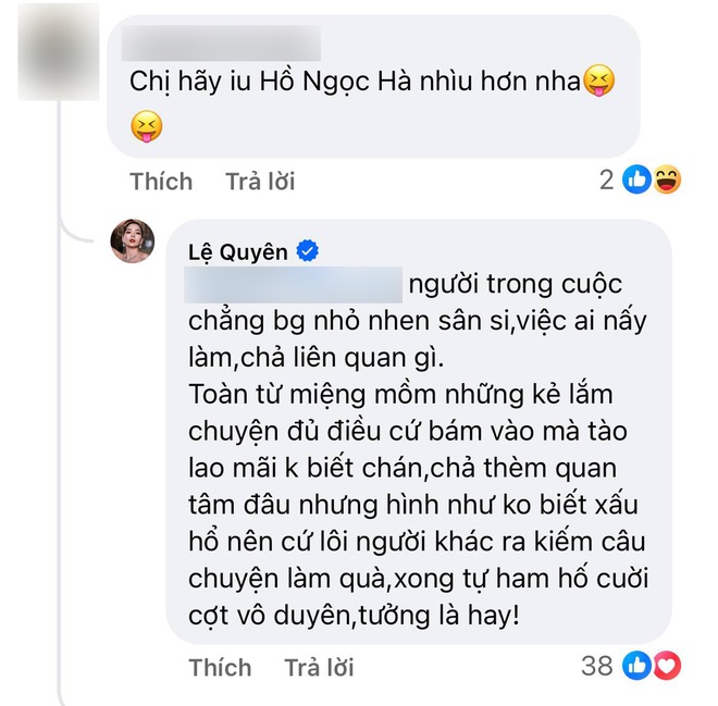 Trước dòng status đầy tâm trạng của Lệ Quyên, đa số netizen cũng tỏ ra đồng cảm với nữ ca sĩ. Tuy nhiên, một netizen không biết vô tình hay cố ý lại nhắc đến Hồ Ngọc Hà trong 1 bình luận khiến Lệ Quyên lập tức phản ứng gắt. Cụ thể, người này đã viết: "Chị hãy yêu Hồ Ngọc Hà nhiều hơn nha" và đây là câu trả lời của giọng ca Thôi đừng chiêm bao: "Người trong cuộc chẳng bao giờ nhỏ nhen sân si, việc ai nấy làm, chả liên quan gì. Toàn từ miệng mồm những kẻ lắm chuyện đủ điều cứ bám vào mà tào lao mãi không biết chán, chả thèm quan tâm đâu nhưng hình như không biết xấu hổ nên cứ lôi người khác ra kiếm câu chuyện làm quà, xong tự ham hố cười cợt vô duyên, tưởng là hay!".