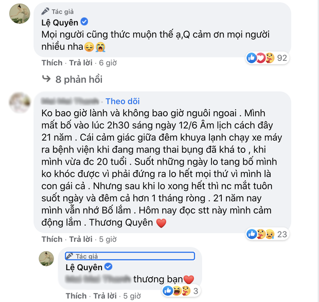 "Không bao giờ con quên được thời khắc này, 12 năm trước... con mất bố. Mẹ con con quýnh quáng, mỗi người một việc lo cho bố trong đêm khuya vắng tanh. Dù chuẩn bị tâm lý nhưng không ai tin là bố sẽ đi! Bố ơi, con biết, bố đã luân hồi từ lâu rồi, bố nhỉ! Nhưng kiếp này, bố là bố của con, duy nhất. Mãi thương nhớ bố (mùng 2/6). Có những nỗi đau không bao giờ lành..." - Lệ Quyên trải lòng.