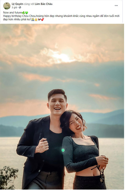 Cách đây ít giờ, Lệ Quyên vừa công khai đăng ảnh tình tứ cùng tình trẻ Lâm Bảo Châu lên trang cá nhân, kèm theo đó là lời nhắn nhủ nhân dịp đặc biệt: "Now and future (Hiện tại và tương lai - PV). Happy birthday Chou Chou, hoàng hôn đẹp nhưng khoảnh khắc cùng nhau ngắm để đón tuổi mới đẹp hơn nhiều phải không?".
