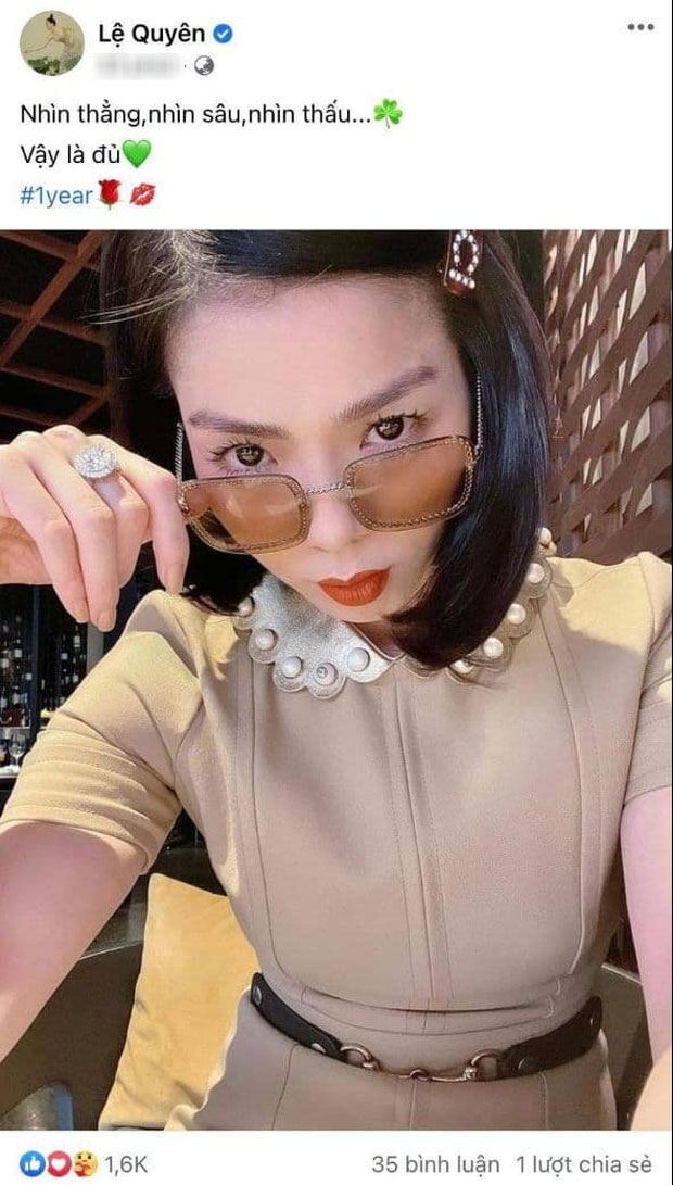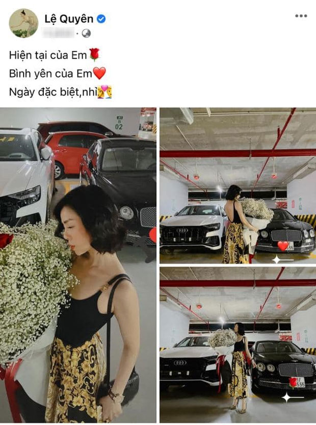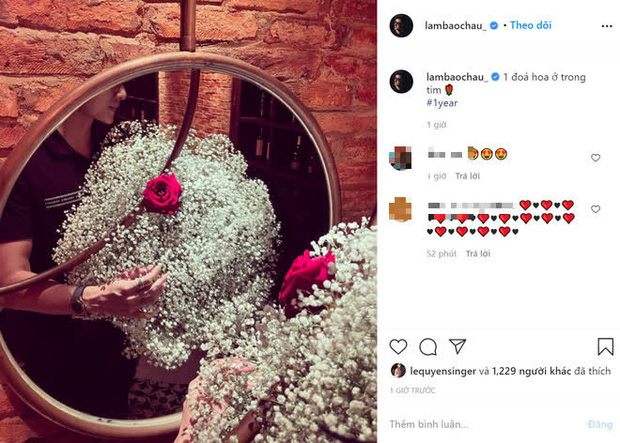 Mới đây, vào ngày 30/12, Lệ Quyên vừa chia sẻ hình ảnh ôm bó hoa lớn kèm dòng trạng thái đầy hạnh phúc: "Hiện tại của em. Bình yên của em. Ngày đặc biệt, nhỉ" và kết thúc bằng biểu tượng một cặp đôi nam - nữ. Ngay sau đó, Lâm Bảo Châu cũng đăng ảnh chụp với bó hoa giống hệt cùng lời nhắn: "Một đóa hoa ở trong tim #1year". Đáng nói, chiếc hashtag #1year này cũng được Lệ Quyên sử dụng trong một bài đăng khác trên trang cá nhân của cô, khiến nhiều người cho rằng cặp đôi tin đồn đang muốn ẩn ý nhắc đến ngày kỷ niệm 1 năm yêu đương.