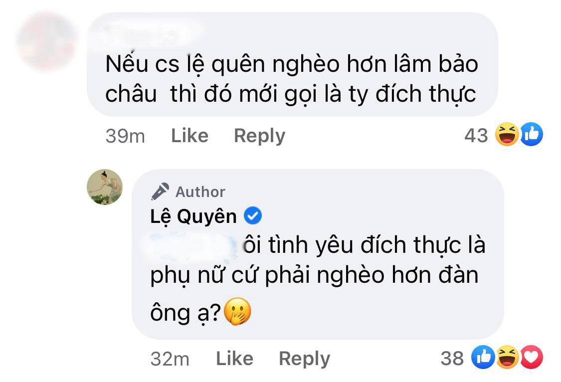 Sau khi antifan xấu hổ xóa bình luận, bên dưới bài đăng lại có một ý kiến cho rằng: "Nếu ca sĩ Lệ Quyên nghèo hơn Lâm Bảo Châu thì đó mới gọi là tình yêu đích thực". Lần này, nữ hoàng bolero chỉ hỏi ngược một câu nhẹ nhàng nhưng sắc bén: "Ôi tình yêu đích thực là phụ nữ cứ phải nghèo hơn đàn ông ạ?".