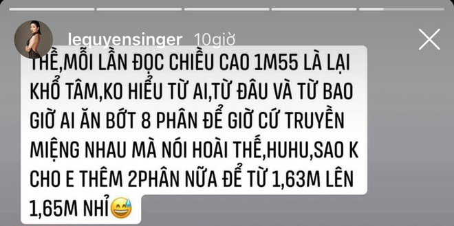 Mới đây, lần đầu tiên nữ ca sĩ đã lên tiếng đính chính lại thông tin này. Theo lời Lệ Quyên, chiều cao thật sự của cô là 1,62m.
