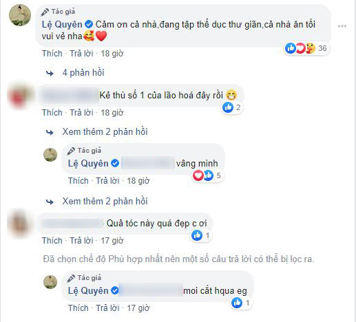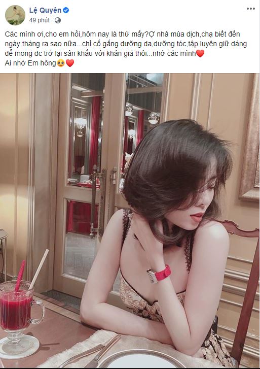 Thông qua những dòng trạng thái mà giọng ca "Sầu tím thiệp hồng" đăng tải lên trang cá nhân, có thể thấy cô đang tận hưởng cuộc sống của mình bằng cách ăn uống, làm đẹp, tập thể dục giữ dáng... Dù không thể đi hát do ảnh hưởng của dịch Covid-19 nhưng Lệ Quyên vẫn giữ cho mình tinh thần lạc quan, tràn đầy năng lượng.