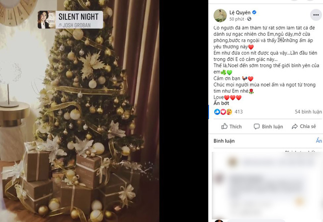 Lệ Quyên chia sẻ: "Có người đã âm thầm từ rất sớm làm tất cả để dành sự ngạc nhiên cho em. Ngủ dậy, mở cửa phòng, bước ra ngoài và thấy những ấm áp yêu thương này. Em như đứa con nít được quà vậy. Lần đầu tiên trong đời em có cảm giác này. Thế là Noel đến sớm trong thế giới bình yên của em. Cảm ơn bạn. Chúc mọi người mùa noel ấm và ngọt từ trong tim như em nhé. Love".