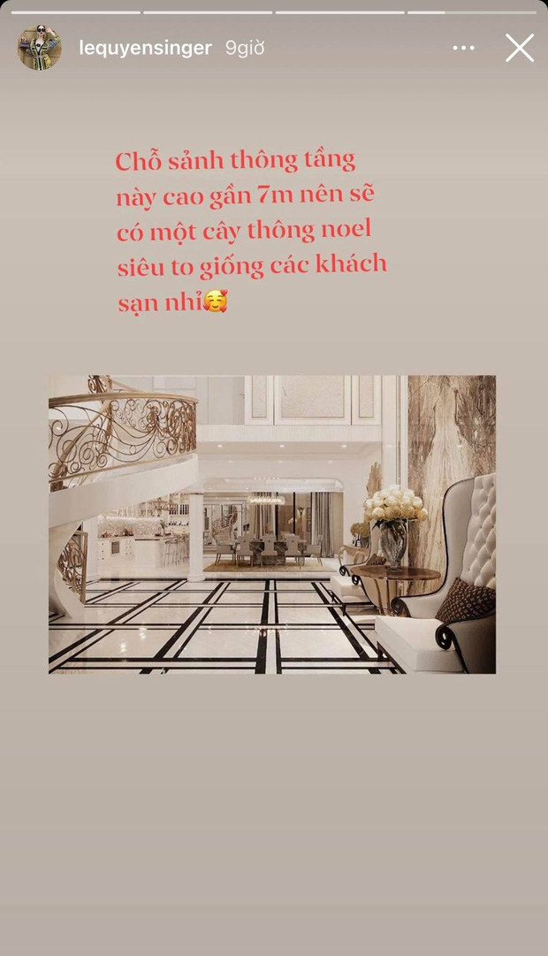 Mới đây nhất, Lệ Quyên hào hứng thông báo căn biệt thự đã hoàn thiện đến 90% và cô sẽ dọn vào ở trong tháng tới. Vì mùa Giáng sinh đã đến gần, nữ ca sĩ còn dự định sẽ đặt một cây thông Noel lớn giữa sảnh, như thế sẽ khiến nhà riêng của cô trông sang chảnh và lộng lẫy không khác gì khách sạn.