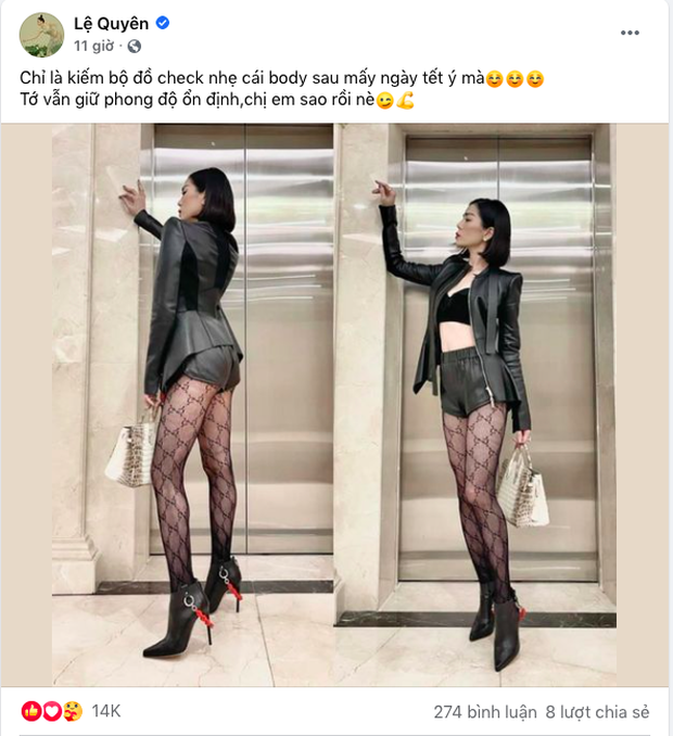 Những ngày đầu năm Tân Sửu, Lệ Quyên bị đồn đoán chuyện đang mang thai khi để lộ vòng 2 có phần lùm lùm trong buổi tụ họp cùng hội bạn Hà Thành gồm vợ chồng Tuấn Hưng - Hương Baby, Quang Hà,... Đối diện với tin đồn này, Lệ Quyên chọn cách im lặng, cô đồng thời đăng tải liên tục hình ảnh đời thường lên MXH. Đến ngày 15/2 (mùng 4 Tết), "nữ hoàng phòng trà" gây chú ý với khoảnh khắc diện diện áo bra bên trong vest, khoe khéo vòng eo nhỏ xíu. "Chỉ là kiếm bộ đồ check (kiểm tra - PV) nhẹ cái body sau mấy ngày Tết ý mà. Tớ vẫn giữ phong độ ổn định, chị em sao rồi nè" - Lệ Quyên bày tỏ.