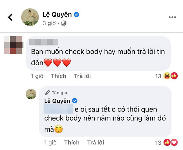 Động thái này của nữ ca sĩ ngay lập tức khiến netizen đặt nghi vấn liệu rằng Lệ Quyên đang muốn kiểm tra hình thể sau những ngày ăn uống thả phanh hay đáp trả tin đồn bầu bí. Bạn gái Lâm Bảo Châu không ngần ngại mà phản hồi cứng rắn: "Em ơi, sau Tết chị có thói quen check body nên năm nào cũng làm đó mà".
