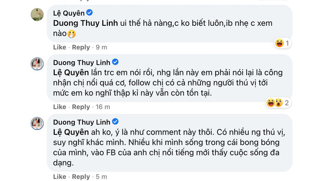 Thấy vậy, Lệ Quyên tò mò hỏi: "Ui thế hả nàng, chị không biết luôn, inbox nhẹ chị xem nào", tuy nhiên Dương Thuỳ Linh đã vội đính chính: "À không, ý là như comment (bình luận) này thôi. Có nhiều người thú vị, suy nghĩ khác mình. Nhiều khi mình sống trong cái bong bóng của mình, vào Facebook của anh chị nổi tiếng mới thấy cuộc sống đa dạng".