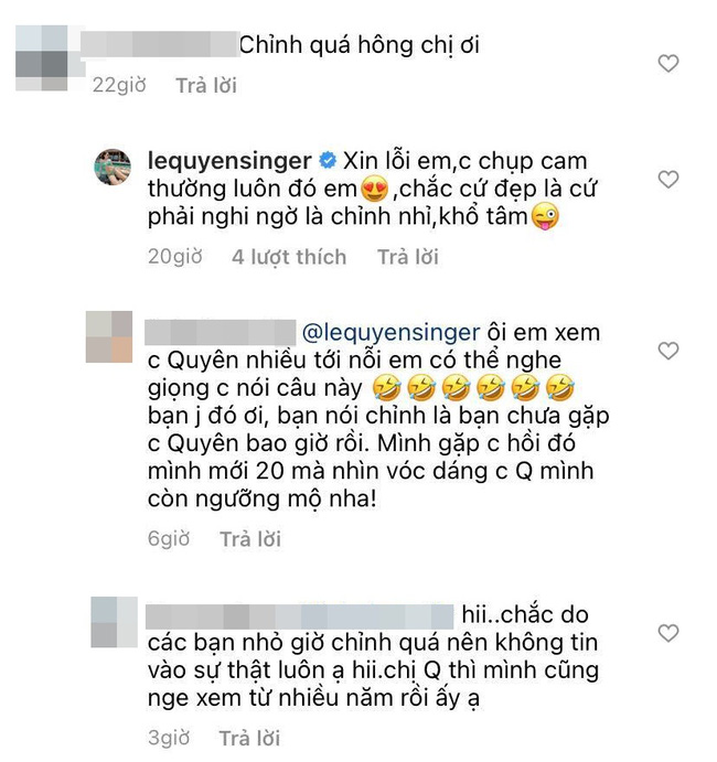 Mới đây, Lệ Quyên tiếp tục thêm vào series ảnh khoe vóc dáng gợi cảm một loạt hình mới. Không ngoài dự đoán, nữ ca sĩ lại bị netizen vào "cà khịa": "Có chỉnh (ảnh) quá không chị ơi". Ngay lập tức, Lệ Quyên lên tiếng đáp trả: "Xin lỗi em, chị chụp camera thường luôn đó em. Chắc cứ đẹp là cứ phải nghi ngờ là chỉnh nhỉ, khổ tâm".
