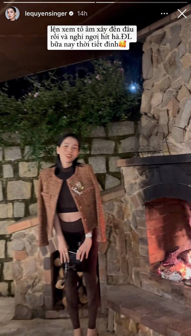 Đặc biệt, mục đích của chuyến đi trước thềm 20/10 này ngoài cho các "chị đẹp" nghỉ ngơi còn là để lên thăm biệt thự nghỉ dưỡng của Lệ Quyên. "Lên xem tổ ấm xây đến đâu rồi và nghỉ ngơi, hít hà. Đà Lạt bữa nay thời tiết đỉnh" - nữ ca sĩ flex nhẹ nhàng.