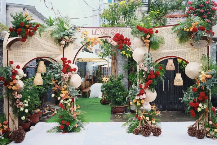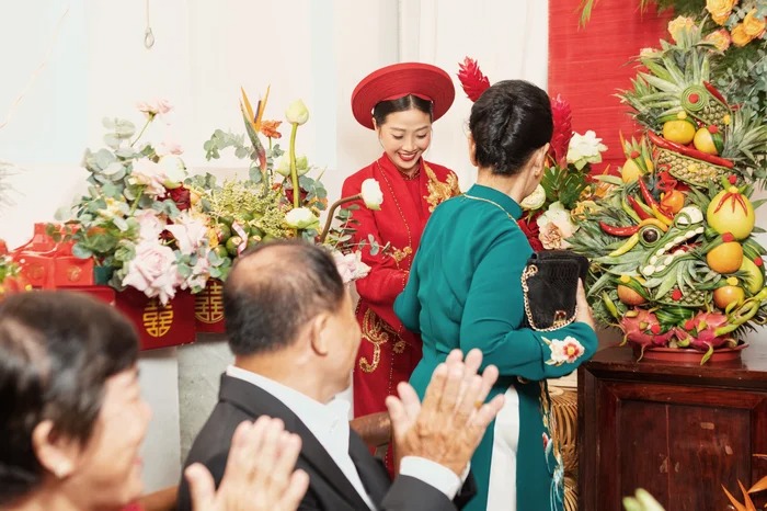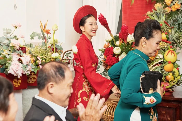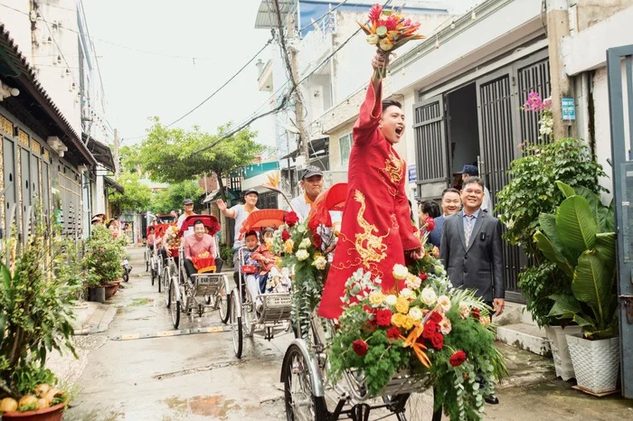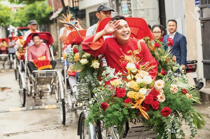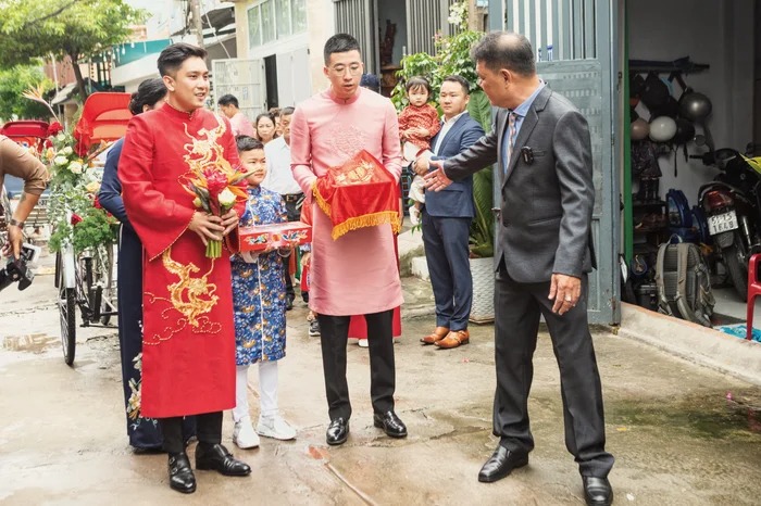 Chú rể Anh Khoa cùng dàn phụ rể “soái ca” (Otis, MC Tài Danh…) có mặt tạ tư gia nhà cô dâu làm những nghi thức truyền thống. Không phải trên những chiếc siêu xe đắt tiền, được trang trí hoa như lễ rước dâu thông thường, hình ảnh chú rể cùng họ hàng nhà trai xuất hiện trên những chiếc xích lô, nối đuôi nhau bưng theo dàn tráp lễ vật.