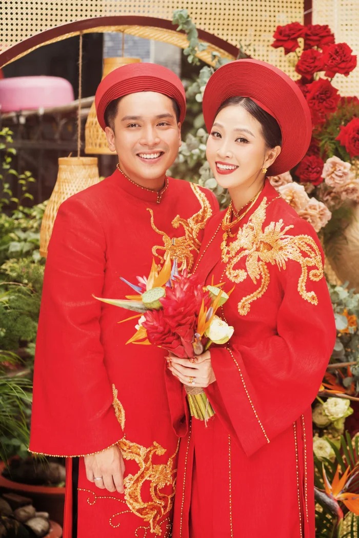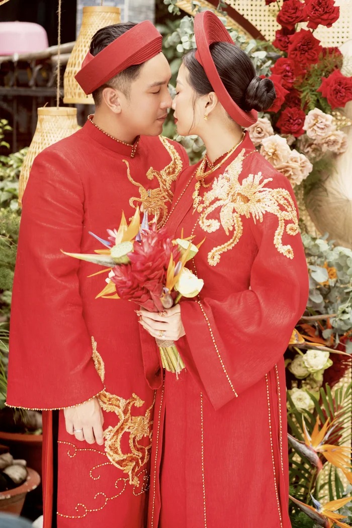 Cả hai không ngại trao cho nhau nụ hôn ngọt ngào trong ngày trọng đại. Nhìn khoảnh khắc này ai nấy đều ghen tỵ. Cô dâu nền nã, nhẹ nhàng trong trang phục áo dài đỏ truyền thống. Chú rể bảnh bao với áo dài cách tân, nhìn cả hai trông rất xứng đôi. Cặp đôi nở nụ cười thật tươi thể hiện rõ niềm hạnh phúc trong ngày trọng đại.