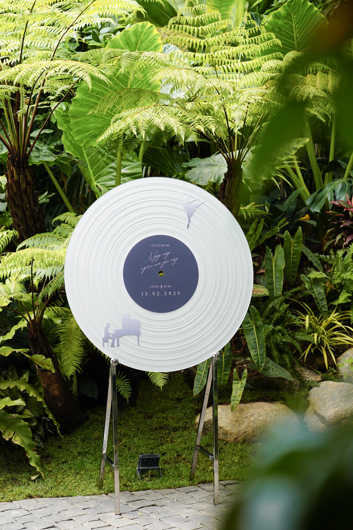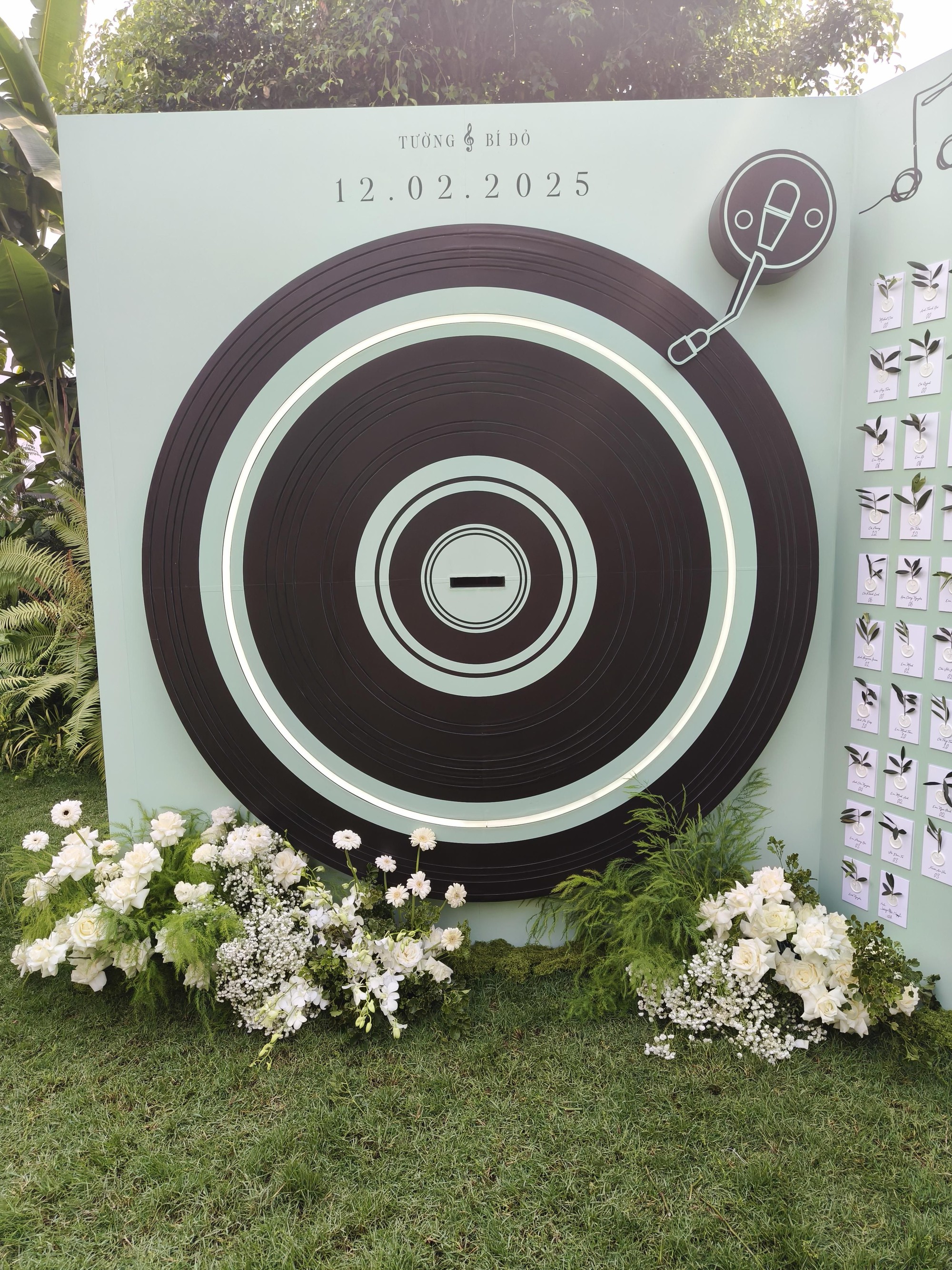Lấy cảm hứng từ niềm đam mê âm nhạc, Vũ Cát Tường đã biến không gian lễ thành đôi thành một bữa tiệc nghệ thuật với tâm điểm là chiếc bàn chạy đĩa than (vinyl) khổng lồ, thiết kế cách điệu với danh sách khách mời đi kèm. Đây không chỉ là điểm nhấn ấn tượng mà còn thể hiện trọn vẹn con đường nghệ thuật của Vũ Cát Tường.