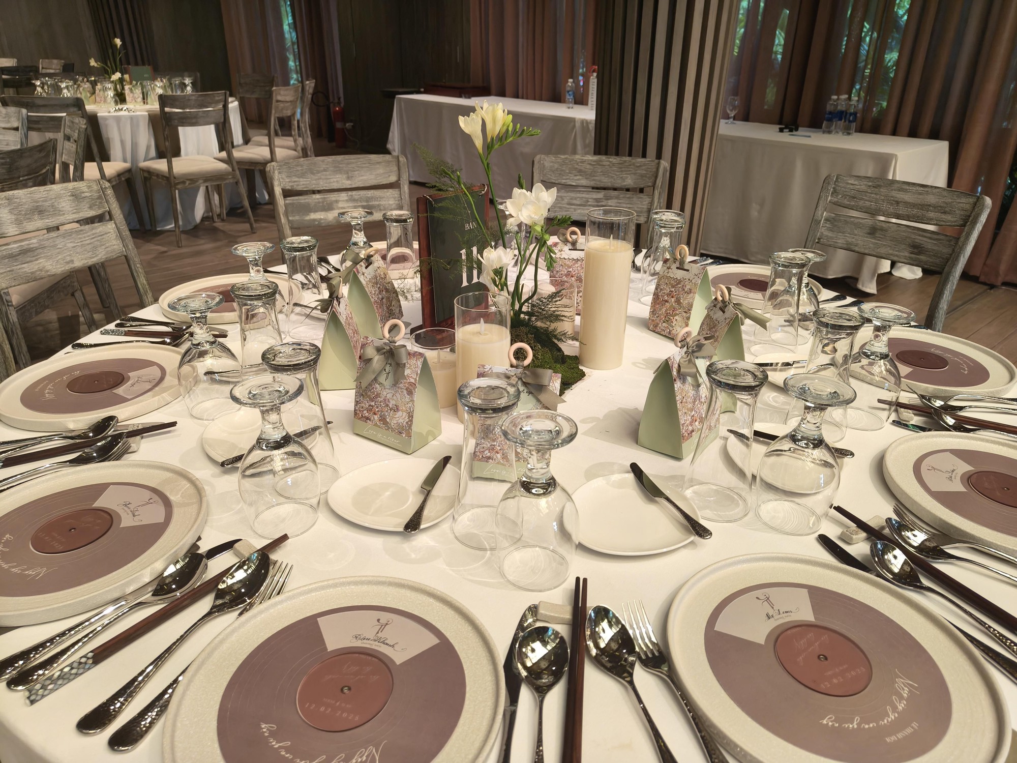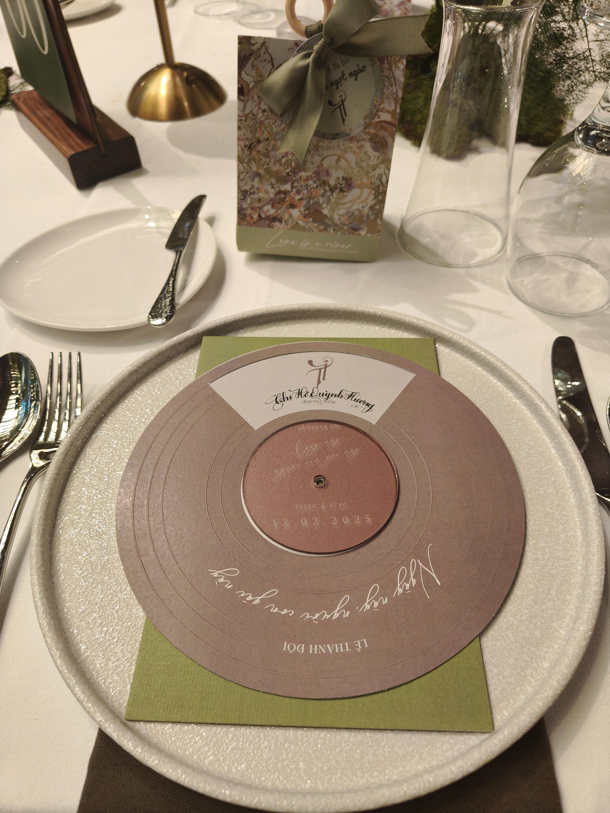 Bên cạnh đó, bàn tiệc cũng được trang trí theo concept này khi sử dụng những chiếc đĩa ăn có thiết kế mô phỏng đĩa nhạc, tạo cảm giác như khách mời đang thực sự hòa vào không gian âm nhạc. Từng vật phẩm nhỏ như thiệp, menu hay quà tặng đều được thiết kế theo tone pastel nhẹ nhàng, sang trọng nhưng vẫn đầy ấm cúng.