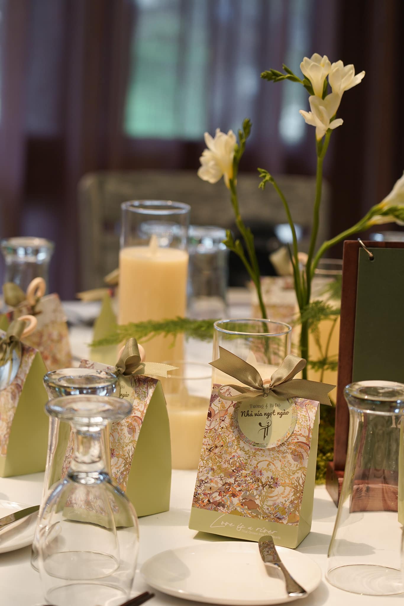 Trên sân khấu làm lễ được sử dụng dải lụa mềm mại kết hợp hiệu ứng ánh sáng dịu nhẹ, tạo cảm giác lãng mạn. Từng chiếc nến được đặt ngay ngắn trên bàn ăn, kết hợp cùng hoa trắng và xanh lá, mang đến sự trang nhã, tinh khôi.