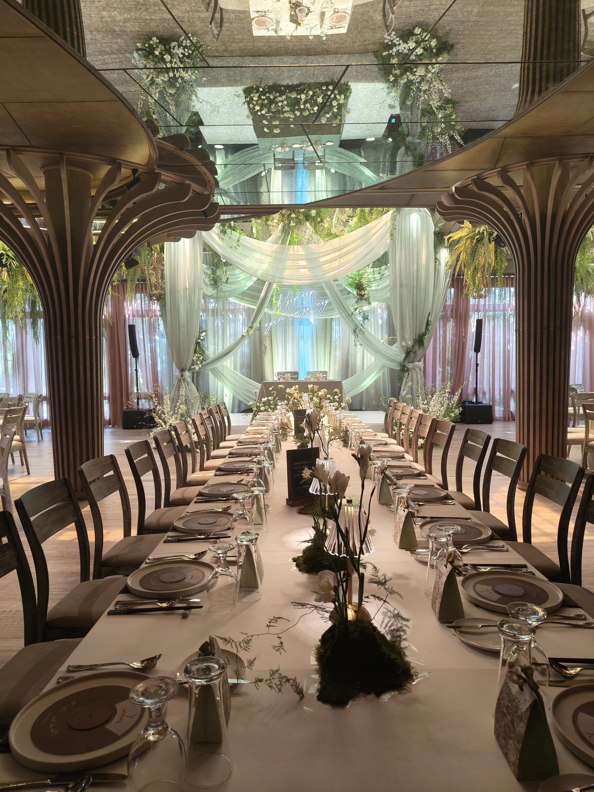 Bên trong khu vực tổ chức tiệc, Vũ Cát Tường và bạn đời tiếp tục mang đến một không gian đầy nghệ thuật với thiết kế bàn dài sang trọng. Những dãy bàn được sắp xếp đối xứng, ghế gỗ mang phong cách rustic gần gũi nhưng vẫn đẳng cấp.