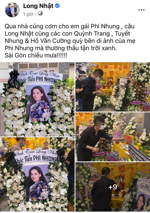 Chiều hôm nay (ngày 1/10), Long Nhật đã đến nhà cố ca sĩ Phi Nhung để cúng cơm và gửi hoa viếng người đồng nghiệp thân thiết. Nam ca sĩ không khỏi đau lòng, nghẹn ngào trước cảnh các con nuôi của ca sĩ Phi Nhung đội tang trắng và quỳ bên di ảnh mẹ. Trên Facebook cá nhân, Long Nhật chia buồn: "Qua nhà cúng cơm cho em gái Phi Nhung. Cậu Long Nhật cùng các con Quỳnh Trang, Tuyết Nhung, Hồ Văn Cường quỳ bên di ảnh của mẹ Phi Nhung mà thương thấu tận trời xanh".